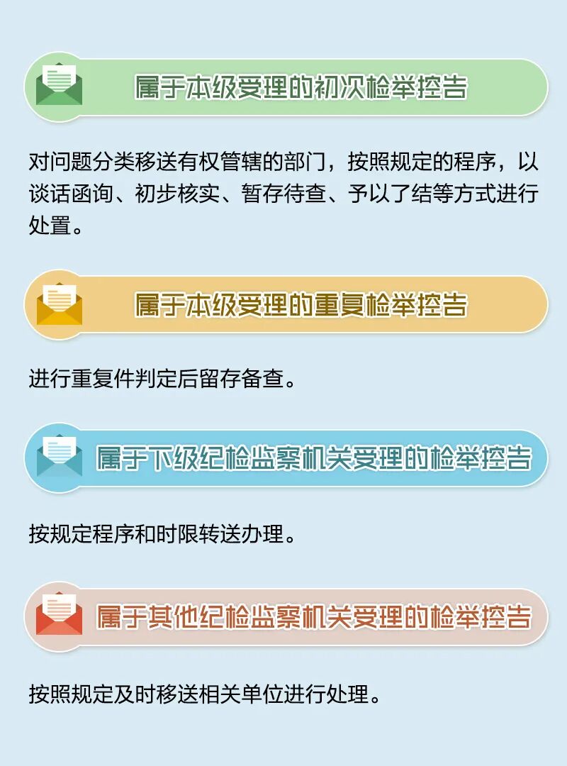 这些就是我们纪检监察机关办理信访举报的基本流程,能不能查处,与您反映问题的真实性有直接关系,所以说——不一定所有反映的问题都会被查处。