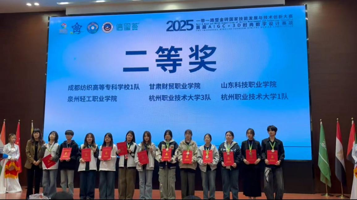 10月31日,2025一带一路暨金砖国家技能发展与技术创新大赛首届AIGC+3D时尚数字设计赛项总决赛在嘉兴职业技术学院落下帷幕。我院2024级服装设计与工艺专业学生来迪娜·努古包力、何亚娟凭借出色的表现,从全国众多参赛选手中脱颖而出,最终斩获该赛项二等奖,学校荣获“优秀组织单位奖”。