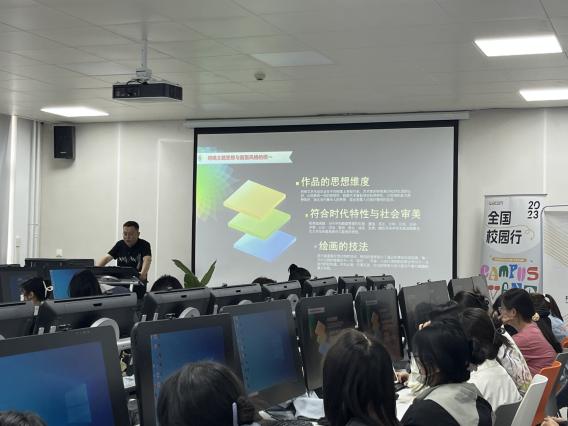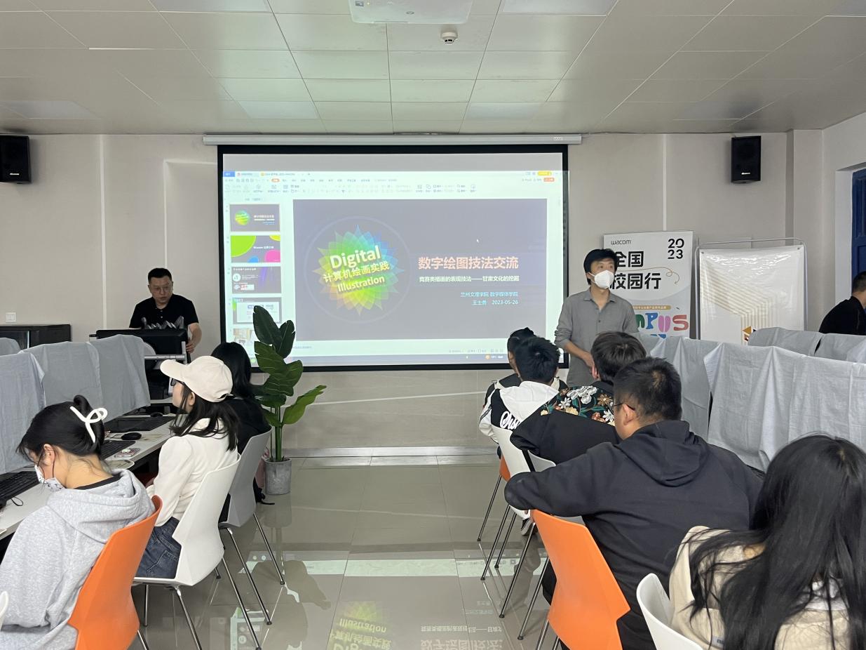 王教授的报告主题是“数字绘图技法交流竞赛类插画的表现技法——甘肃文化的挖掘”。他以自身积累的经验和丰富的阅历,主要围绕专业创意产品领导品牌、竞赛类赛事及案例分析、插画创作的流程、主体思想与画面风格的统一、基于甘肃文化的数字插画创作等方面进行讲解。