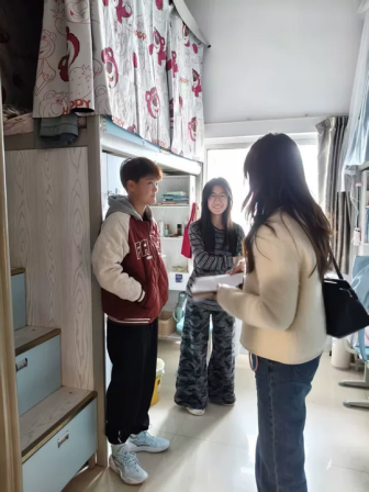 调研小组在学生代表引导下,走访宿舍,查看住宿环境,叮嘱用电安全与宿舍整洁,鼓励学生及时反馈困难与诉求,让学生感受到学院给予的关怀与温暖。