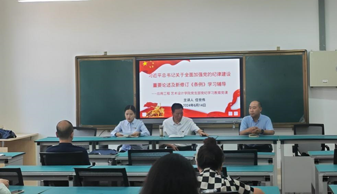 为深入学习和贯彻落实习近平总书记关于全面加强党的纪律建设的重要论述,进一步提升党员同志们的政治觉悟和纪律意识,6月14日,学院党委委员、纪委书记任世伟为应用工程学院和艺术设计学院党支部开展习近平总书记关于全面加强党的纪律建设重要论述及新修订《条例》的党纪学习教育专题党课活动。应用工程学院和艺术设计学院全体中层干部和全体党员共三十余人认真聆听了本次党课。