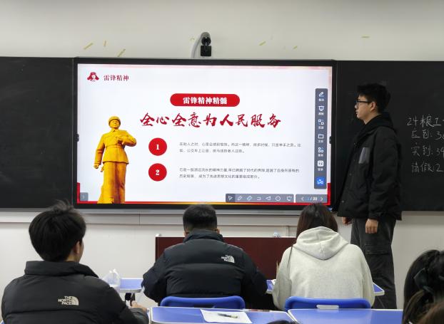 在班会上,各班团支书通过PPT展示雷锋生平事迹,讲述雷锋同志从孤儿到先进典型的成长历程,展现时代与个人命运的紧密联系。同学们围绕雷锋同志“为人民服务”的事迹展开讨论,从点滴善举中感悟奉献精神。雷锋同志的“把有限的生命投入到无限的为人民服务中去”“做一颗永不生锈的螺丝钉”等语录引发了同学们的强烈共鸣,给同学们带来了深刻的思考。