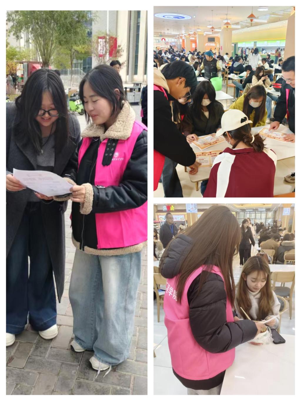 为推动活动的顺利进行,50名志愿者被划分为5个小组,分别负责两个食堂的内外区域宣传工作。其中,内部组在就餐区域引导同学们按需取餐、主动打包剩余食物;而外部组则在食堂入口处进行节约知识的讲解,并组织开展“光盘打卡”活动,以增强同学们的参与感和节约行为的主动性。我们呼吁全体师生按需取餐,摒弃“面子”观念导致的浪费行为,坚决拒绝剩菜剩饭,让“光盘行动”成为每位师生的自觉选择。