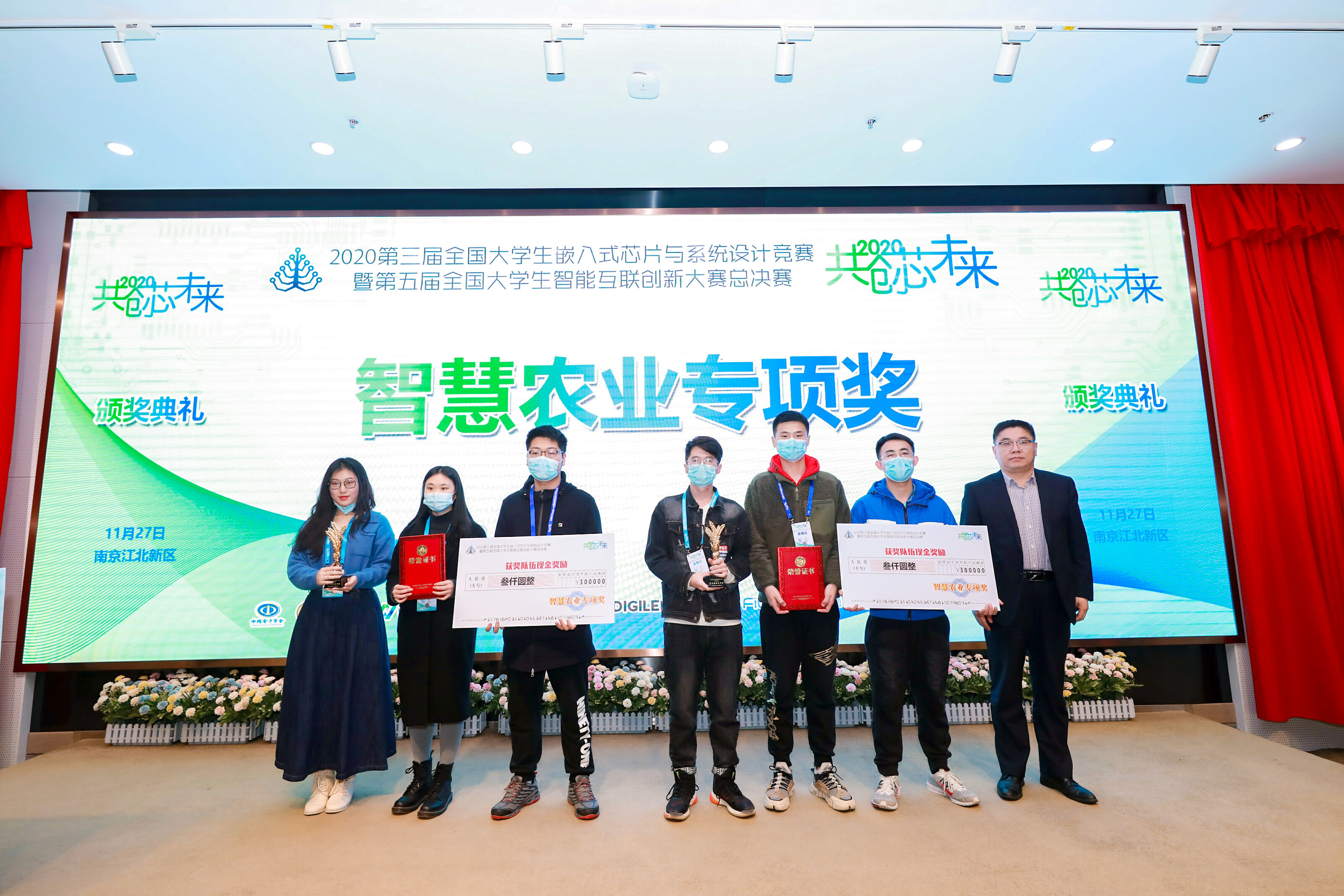 郭宋、仝曦熳、张妮组项目“基于机器视觉的稻麦播种漏播检测及智能补种装置”荣获一等奖和智慧农业专项奖,并获奖金6千元;陈涛、袁朴冰、陈悦洁组项目“基于FPGA和暗通道先验算法的便携式雾透仪”荣获三等奖,并获得奖金1千元。同时,我院学生还荣获东部赛区一等奖2组,二等奖3组,三等奖2组。