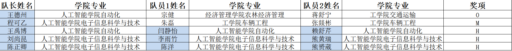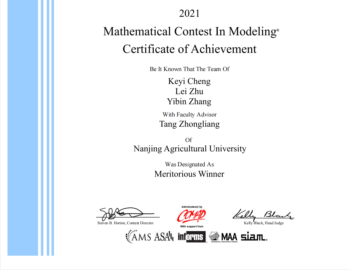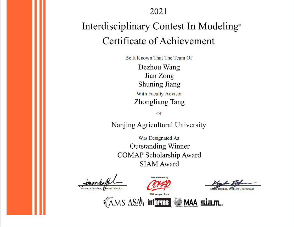 4月24日,2021年美国大学生数学建模竞赛和交叉学科建模竞赛(MCM/ICM)成绩揭晓,我院11名学生获奖。其中,我院18级自动化专业王德州为队长、经济管理学院农林经济管理专业宗健、工学院交通运输专业蒋舒宁为队员组成的队伍(指导教师唐中良)喜获O奖(国际特等奖),额外获得了两项冠名奖(COMAP Scholarship Award & SIAM Award,COMAP Scholarship Award 仅奖励全球成绩最佳的四支参赛队伍,奖金为一万美元,SIAM Award 仅奖励全球成绩最佳的六支参赛队伍)。这是我校大学生首次获得Outstanding Winner层次奖项。另有18级电子信息专业程可乙为队长,工学院车辆工程专业朱磊、张燚彬为队员的队伍(指导教师唐中良)获M奖1项。其余9名人工智能学院学生组成的3支队伍获H奖3项。