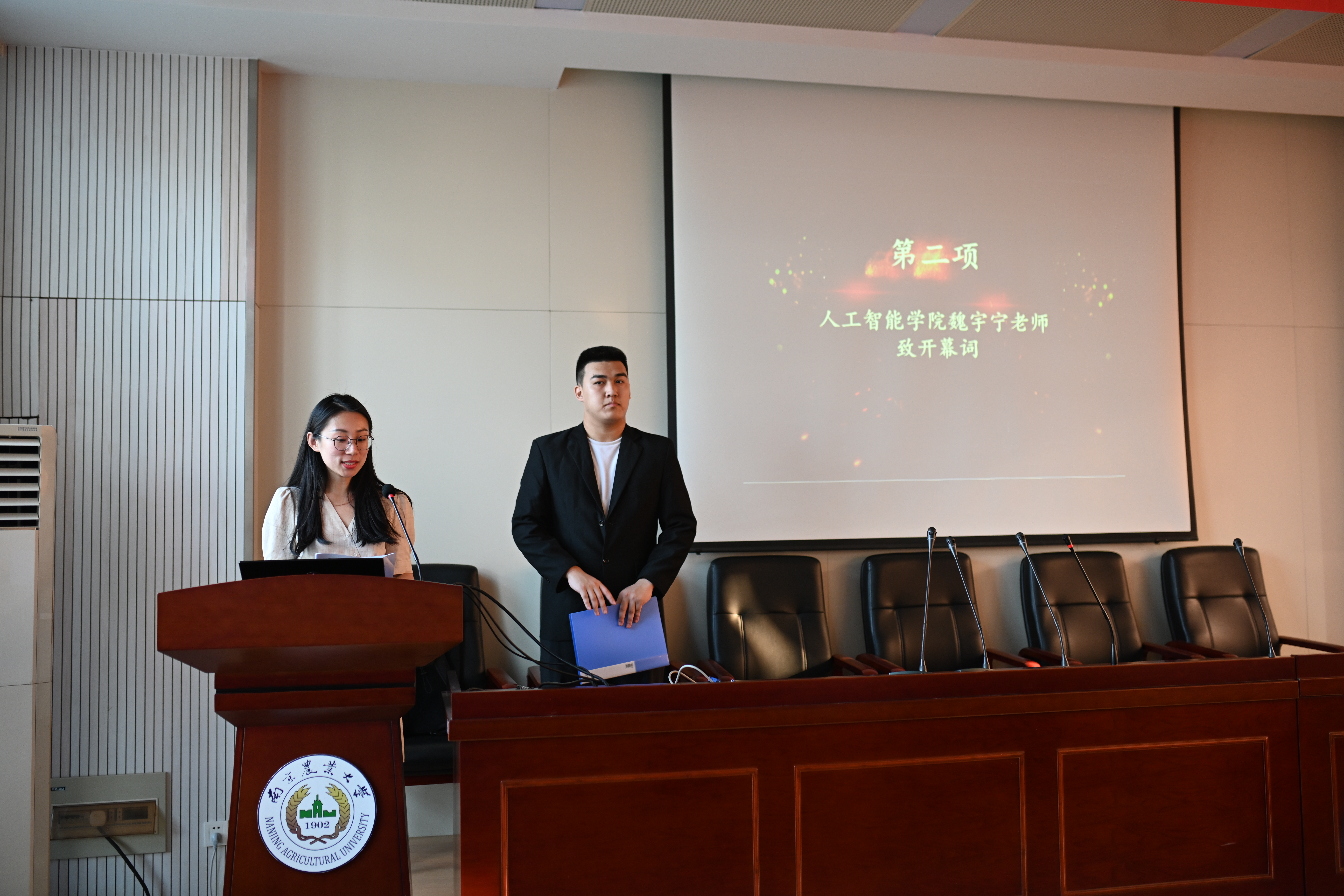 17时30分,主持人刘露阳宣布会议开始。全体与会人员起立唱国歌。随后辅导员魏宇宁致开幕词,她对过去一年学生组织的辛勤付出和无私奉献表示衷心的感谢,并对学生干部提出三点要求:一、认清形势,明确任务,找准工作着力点。要以为本院广大师生做实事为宗旨,找准工作节奏;二、求真务实,勇于创新,开拓工作创新点。需要一切从实际出发,认真负责,精益求精;三、提高素质,做好表率,强化自身硬实力。要合理分配学习和工作,做到人品好、学习好、工作好。