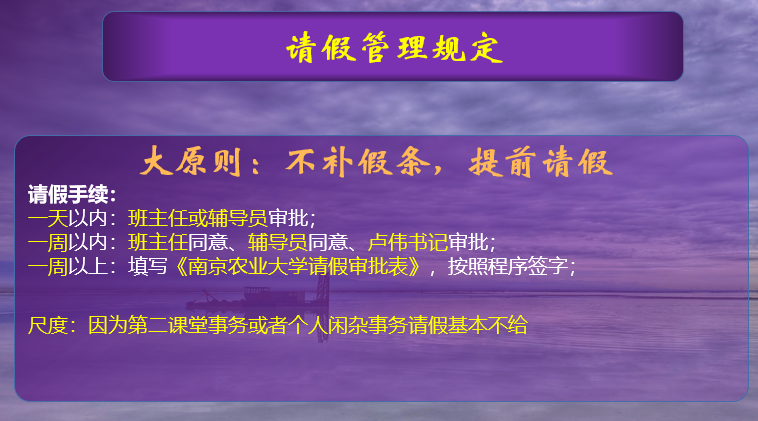 上课纪律方面,侯硕强调了请假管理规定的一条原则:不补假条,提前请假。还强调了因第二课堂事务或者闲杂个人事务请假不予批准的情况。
