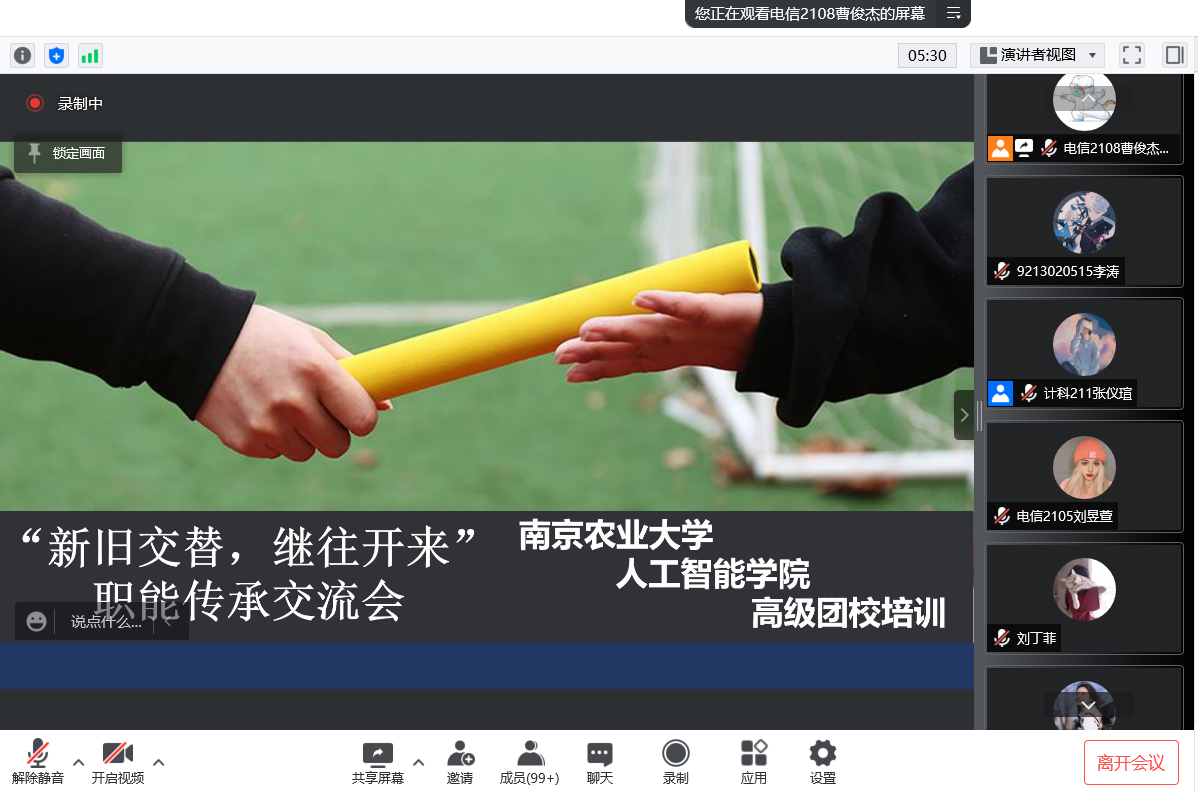 2022年4月16日14时,人工智能学院于线上召开高级团校培训之“新旧交替,继往开来”职能传承交流会。人工智能学院学生组织全体成员参加培训。学生团委常委吴予欣、组织部部长任素慧及秘书处部长施芸芸出席本次会议。