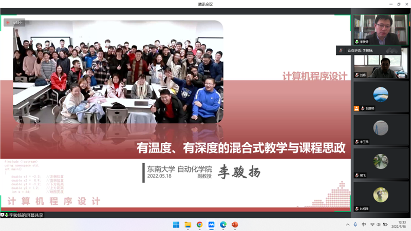 2022年5月18日,人工智能学院邀请东南大学自动化学院李骏扬副教授开展了“有温度、有深度的混合式教学与思政设计”专题讲座,会议由刘杨副院长主持,多名教师线上参与分享交流。