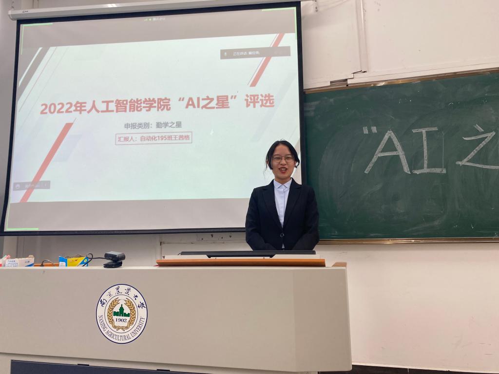5月18日18:00,答辩环节正式开始。人工智能学院辅导员魏宇宁、邬晓倩,信息管理学院研究生会主席孙婷婷,2020-2021学年度“AI之星”代表仝曦熳出席并担任评委。12名候选人分别进行3分钟的个人展示,自强之星竞选者汪再冉面对转专业后巨大的专业课压力并未选择“躺平”,而是不断克服困难,直面挑战。目前成绩排名专业第7,完美诠释自强之星的良好品质。勤学之星竞选者王茜格、江志健、王琬婷,均位列专业第一,且很好地平衡了学习、科研、学生工作三者之间的关系,在专业学习中具有较好的榜样示范作用,同时能够帮助和带领同学共同进步。科研之星竞选者曹柏源、郭振涛、杨凯云、刘尚昆分别展示了自己在学校参与的各项科研项目,并均以第一作者发表论文并被中文核心期刊正刊、SCI等全文收录,为拉近学生与科研之间的距离起到了积极促进作用。服务之星竞选者王圣元、熊黄瑞不仅成绩优异,科研能力较强,且在学生组织、团务助理工作中积极主动,服务同学,帮助低年级学弟学妹答疑解惑、指引方向,充分发挥了学生干部的榜样引领作用。文体之星竞选者曹钰沆学习成绩优异、热爱运动,在校运动会等比赛中取得优异成绩,积极带动身边人参与体育锻炼,为学院营造良好的校园文化氛围发挥重要作用。最终,12名竞选者凭借自己的优异表现均获得“AI之星”称号。