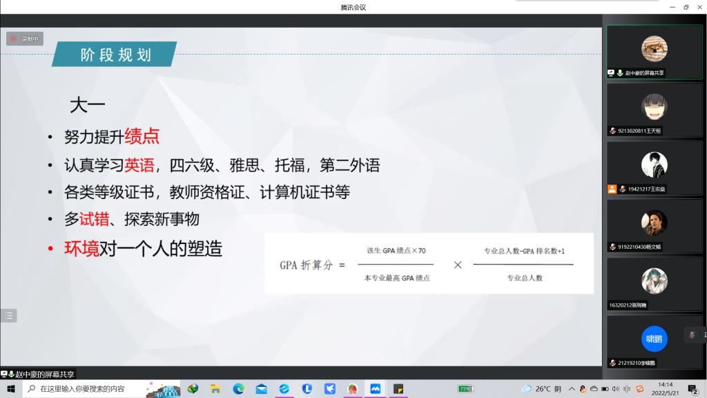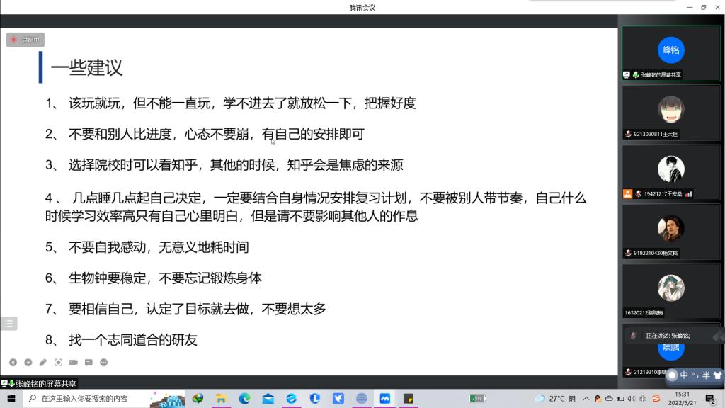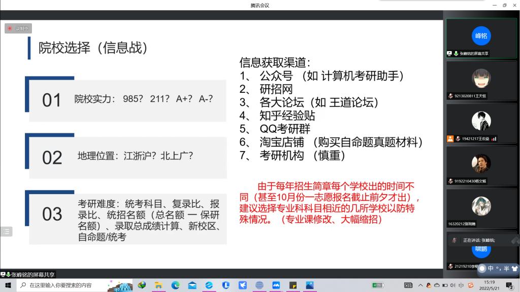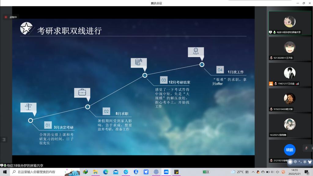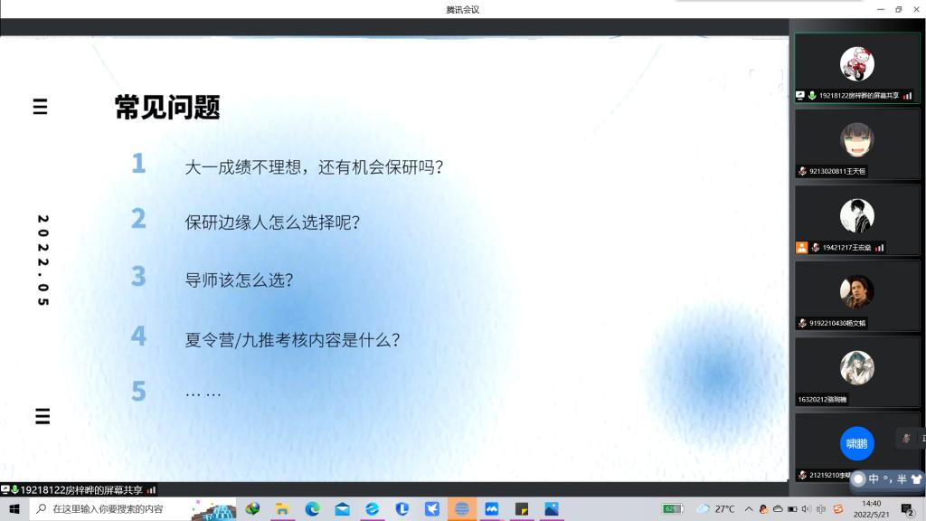 2022年5月21日14时,人工智能学院于线上召开“AI科研月”——“努力拼搏,研出未来”保研考研知识讲座。保研学子赵中豪、房梓晔,考研学子孙梦、张峰铭出席本次活动。本次活动面向人工智能学院全体学生。