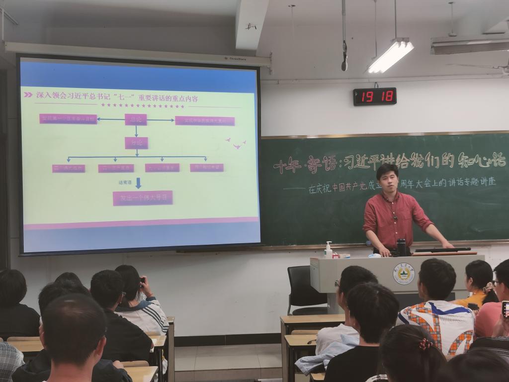 何旭以两个一百年的奋斗目标作为总论,讲述了两个一百年的奋斗目标自1997年十五大提出,到2021年全面建成小康社会,解决了绝对贫困。随后,何旭着重对于“七一”讲话所提出的新思想新观点新要求进行了讲解。他表示:“马克思主义中国化成功后,我们的底气不只是探索,而是引领,这将是对中国共产党、中国人民的新的考验。我们根本性的立场,就是人民立场,未来国际的发展、民族进步,也同样要坚守人民立场。今天在新的征程上,我们仍然要紧紧依靠人民去创造历史。”