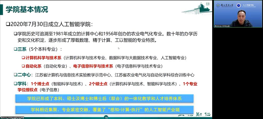 讲座中,田永超书记从学院的师资力量、党建工作、学科介绍、国际交流与合作、科学研究、社会服务、人才培养等方面,向新生们详细地介绍了人工智能学院的发展历程以及各系、各专业的基本情况。他强调学院致力于科研创新,注重专业教学与科研相结合。在人才培养方面,学院拥有优秀的师资队伍,具有高级职称的教师占学院教师总数的70.1%,一直奉行“汇智,赋能”学院精神,聚力培养“通晓农业、厚载数理、精于计算、工以智能”的复合型人才。他指出,尽管人工智能学院是南农最“年轻”的学院之一,但是已经在科研和就业方面展现出大好前景,目前正不断夯实办学基础,努力实现全面发展的新跨越。他还提到,学院注重区域产学研联合的专业共建,与一批优秀企业开展合作,让学生有更多的实践和就业机会,相信通过同学们不懈的努力,都能够大有作为。