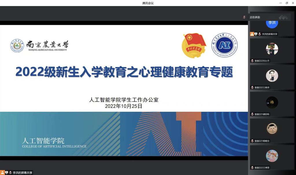 10月25日晚,南京农业大学大学生心理健康教育中心许梓薇老师应邀为人工智能学院2022级新生带来题为《存在,就是向世界伸出你的手——学会在关系中成长》的心理健康教育讲座。本场讲座采用线上直播的方式,新生辅导员李洪老师主持,全体新生参加。
