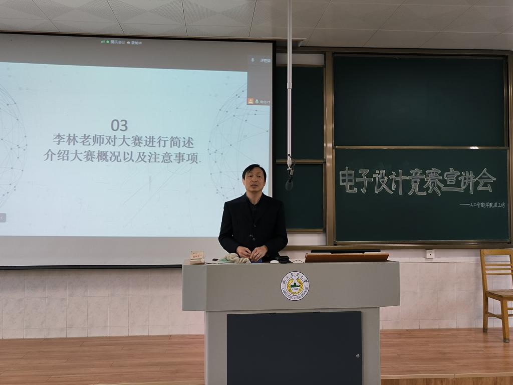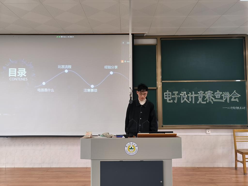 2022年11月25日下午2点至4点,人工智能学院AI工坊在培训部408举办了全国大学生电子设计竞赛宣讲会。全国大学生电子设计竞赛是教育部和工业和信息化部共同发起的大学生学科竞赛之一,旨在推动高等学校促进信息与电子类学科课程体系和课程内容的改革。竞赛中既有理论设计,又有实际操作,全面检验和加强参赛学生的理论基础和实践创新能力。