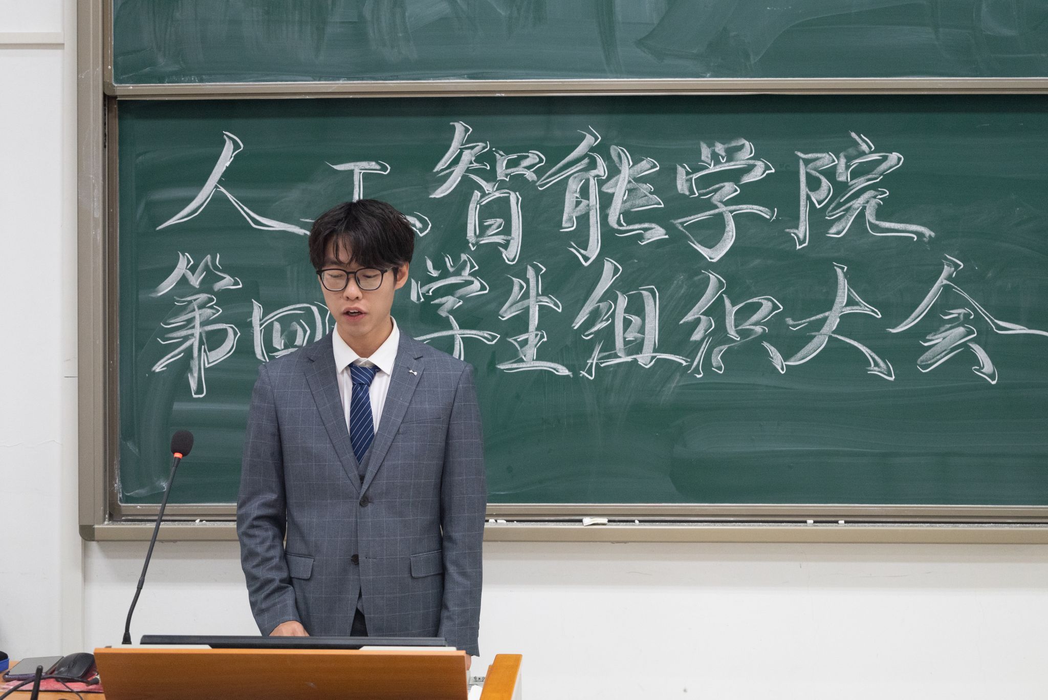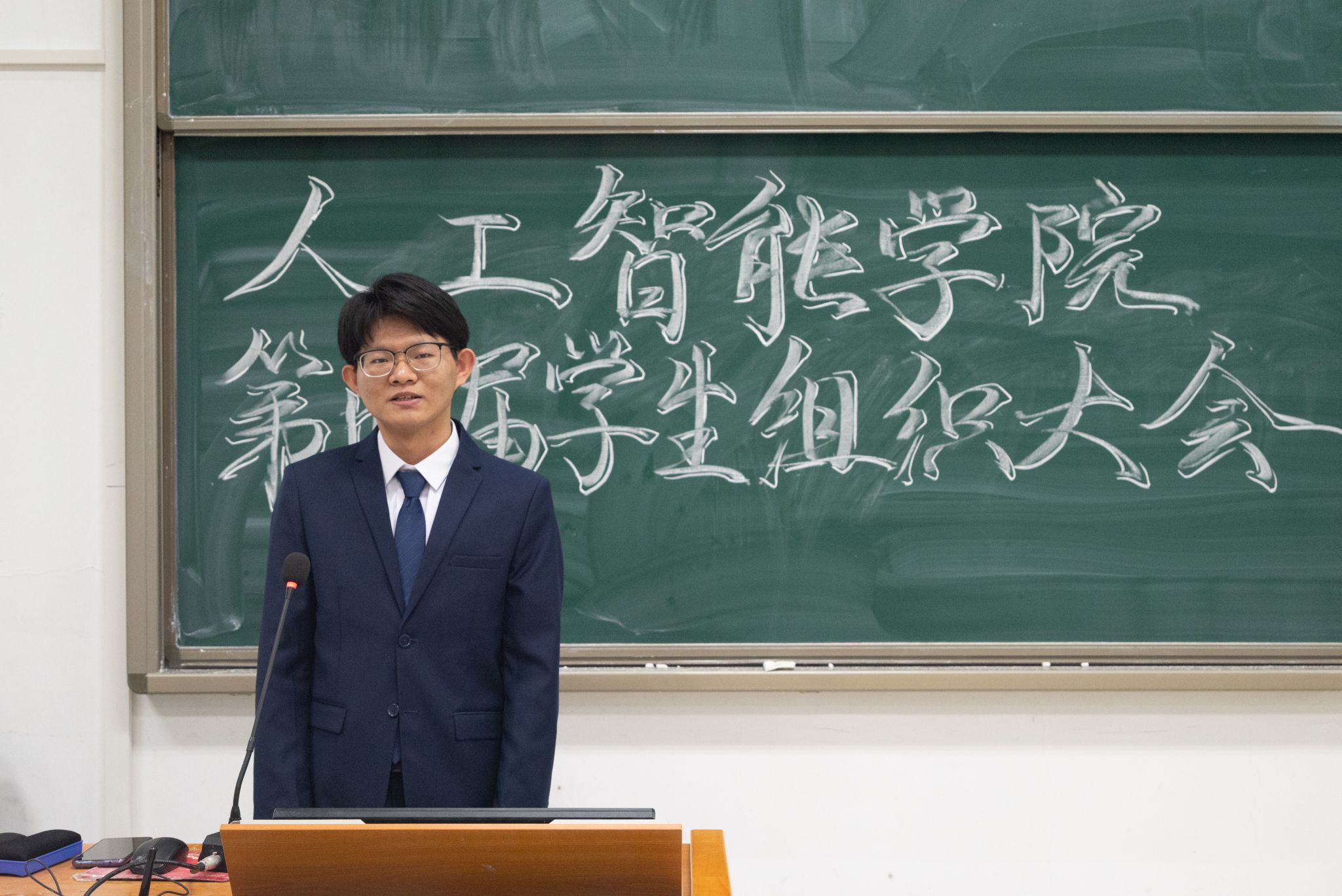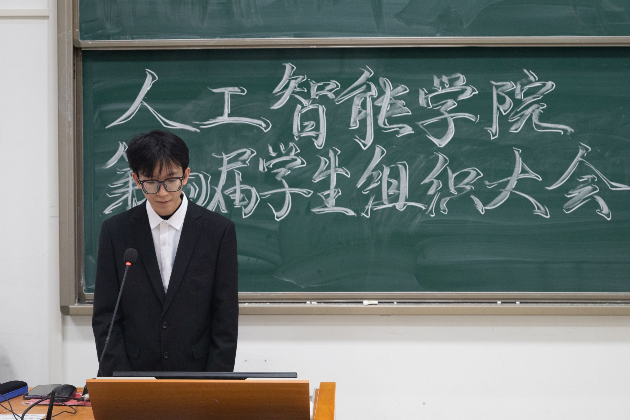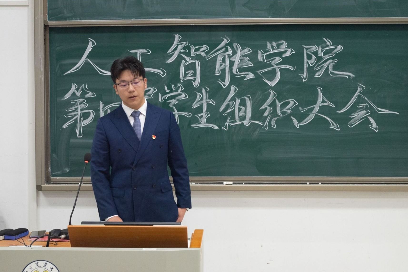 随后,议程第二项,分党校秘书长沈豪杰、学生团委副书记王佳辰、学生会执行主席吴刘柯、全媒体中心主任黄逸宸、AI工坊主席张国航依次上台,分别介绍了学院五大学生组织的职责分工与建设成果,充分展现了我院学生骨干“引领青年,凝聚青年,服务青年”的创新实践本领。