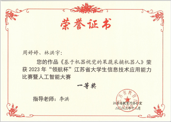 近日,接省教育厅《关于公布2023年“领航杯”江苏省大学生信息技术应用能力比赛暨人工智能大赛获奖结果的通知》,人工智能学院本科生周婷婷、林洪宇提交的作品《基于机器视觉的果蔬采摘机器人》,从773个参赛作品中脱颖而出,斩获大赛一等奖,列总榜第三名,刷新了我院学子参加本项赛事以来的最好成绩。