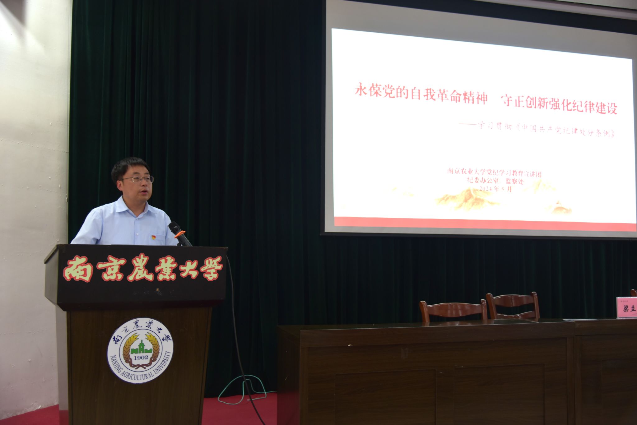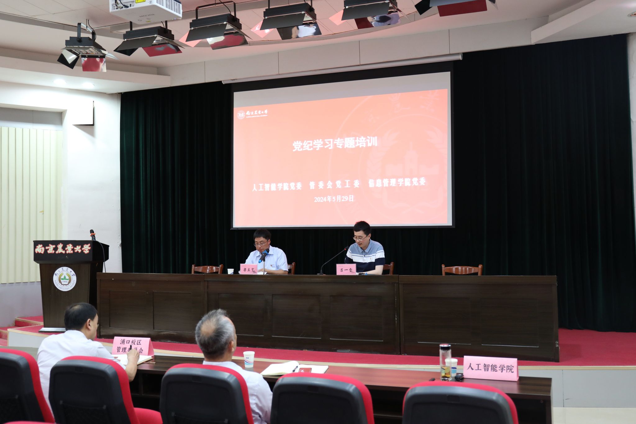 为贯彻落实习近平总书记关于党纪学习教育的重要讲话和重要指示精神,深入学习《中国共产党纪律处分条例》(以下简称《条例》),认真贯彻落实《中共南京农业大学委员会关于深入开展党纪学习教育的实施方案》的决策部署,推动党纪学习教育走深走实,5月29日,人工智能学院党委联合浦口校区管委会党工委、信息管理学院党委,共同举办党纪学习专题培训,校监察处副处长(主持工作)、纪委办公室副主任(监督检查室主任)梁立宽应邀作专题辅导报告。三家单位领导班子成员、教职工党员参加培训。培训会由人工智能学院党委副书记吕一雷主持。