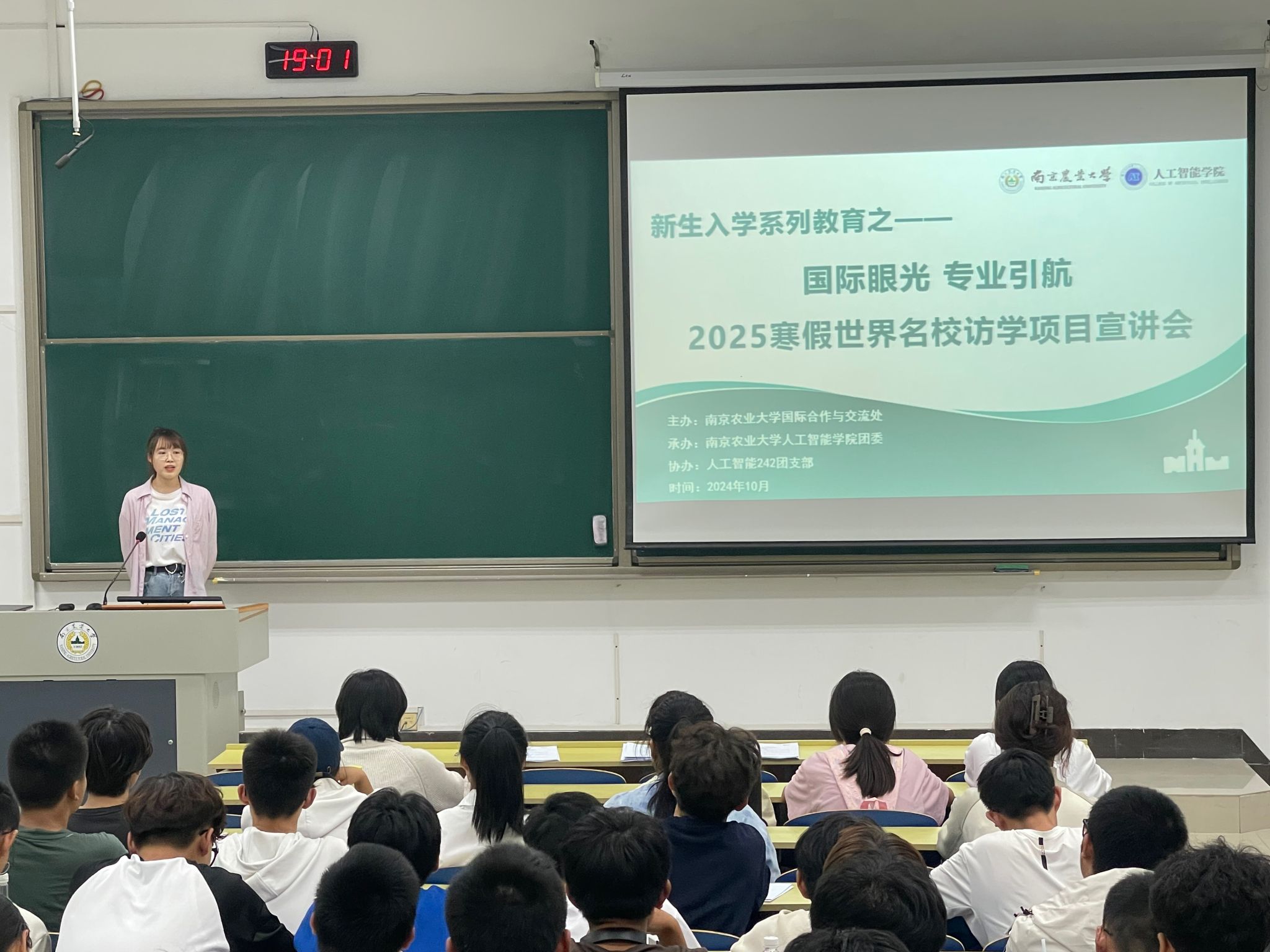 为促进我校教育教学的多元发展,拓宽学生的国际视野,提升学生的跨文化交流和综合素质,2024年10月15日晚19:00,南京农业大学人工智能学院联合南京农业大学国际合作与交流处,邀请全美思行国际教育的项目负责人闪婷婷在博远楼C301为浦口校区学子开展2025年寒假线下世界名校探访项目说明会。人工智能学院本科生专职辅导员于佳琪出席本次活动,人工智能242班团支部参与协办。