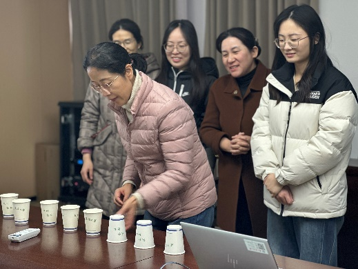 心随杯动,快乐翻转。素质拓展项目快乐翻“杯”,由两个队伍同时出发,依次单手将纸杯翻转完成后与下一位队员击掌接力,依次进行,最先完成的队伍获胜。