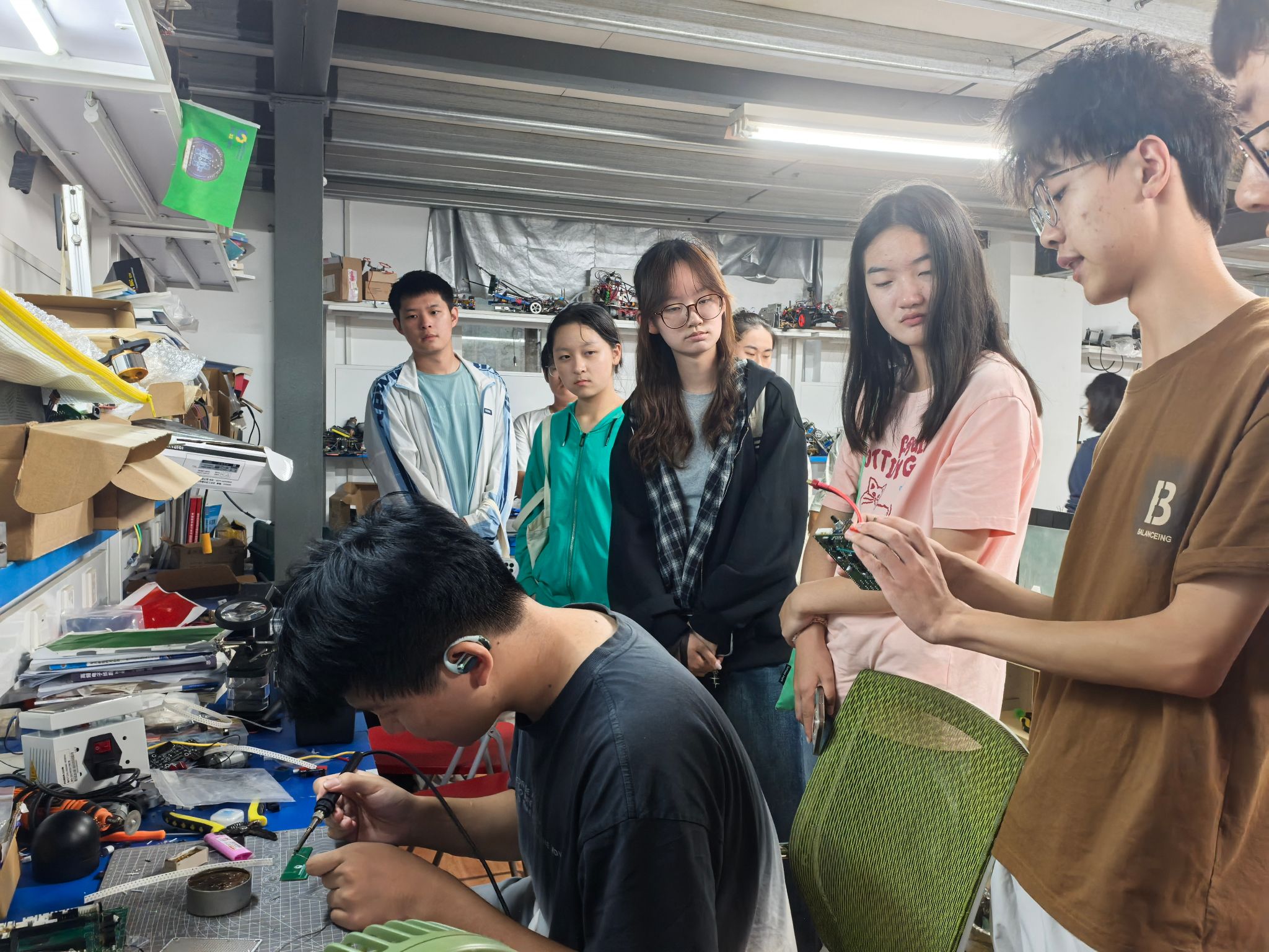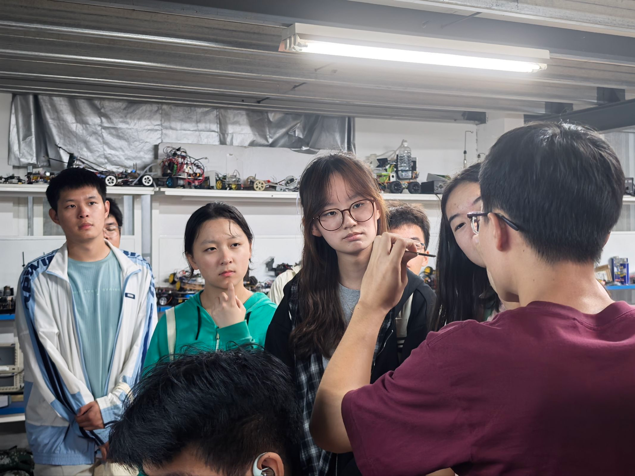 在机器人创新实验室,负责人向新生介绍了实验室以“机器人大赛+智能车大赛”为核心载体的培养模式。讲解内容包括电子研发、机械结构设计、建模仿真等核心方向,并现场演示了基础的电路板焊接技术,让新生直观感受到硬件实现的第一步。同时向新生展示了近年来在国家级、省部级比赛中获得的荣誉证书与实物作品。实验室强调“以赛促学、以学促用”,鼓励新生尽早参与SRT项目或竞赛集训,在实战中提升综合能力。