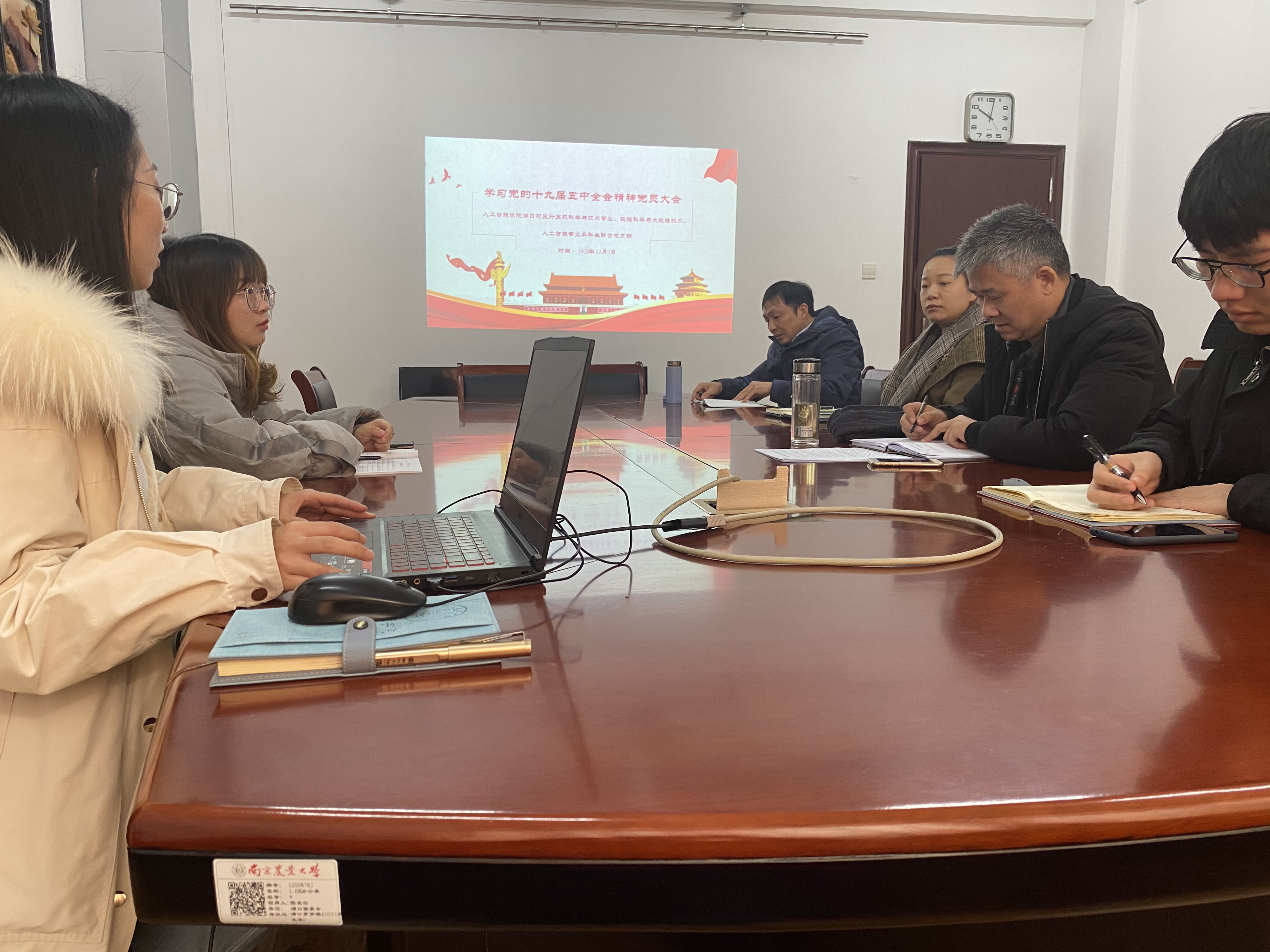 12月3日,人工智能学院浦口校区计算机科学与技术、数据科学与大数据技术、人工智能专业本科生联合党支部召开党员大会,深入学习贯彻党的十九届五中全会精神。会议由支部书记魏宇宁主持,张和生等全体党员参加。