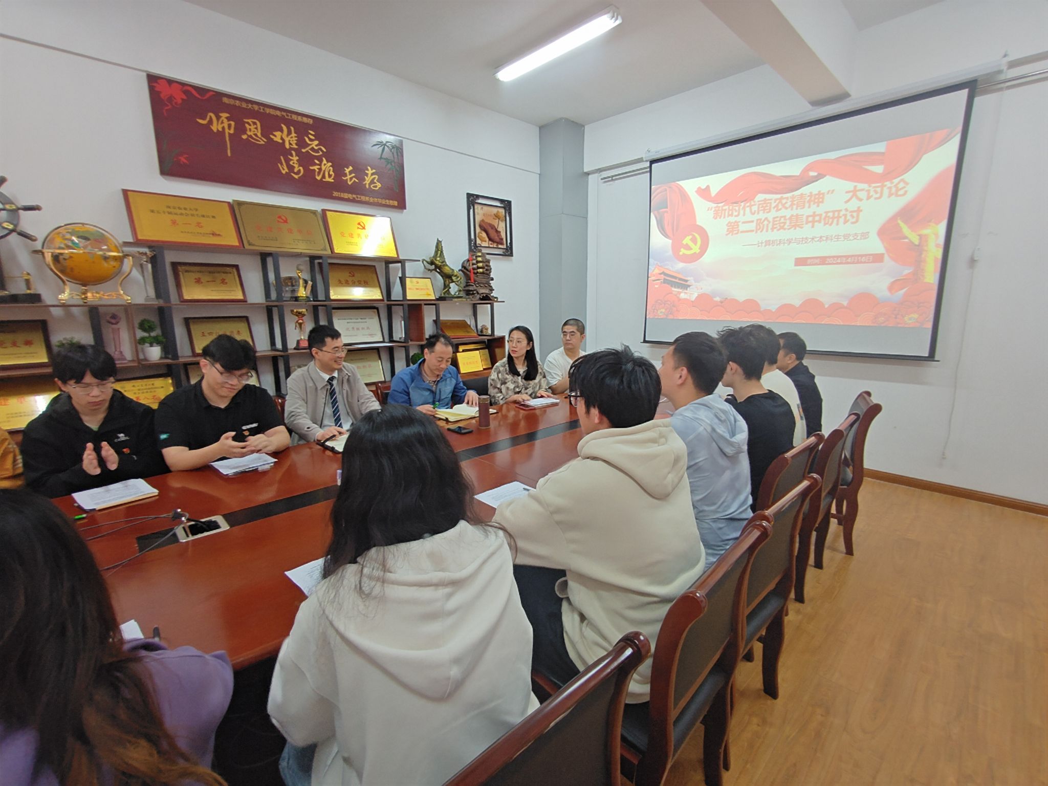 4月16日上午,人工智能学院计算机科学与技术专业本科生党支部在育贤楼B311召开第二阶段“新时代南农精神”大讨论座谈会。院党委书记田永超,党委副书记吕一雷,支部全体党员参会,会议由支部书记魏宇宁主持。