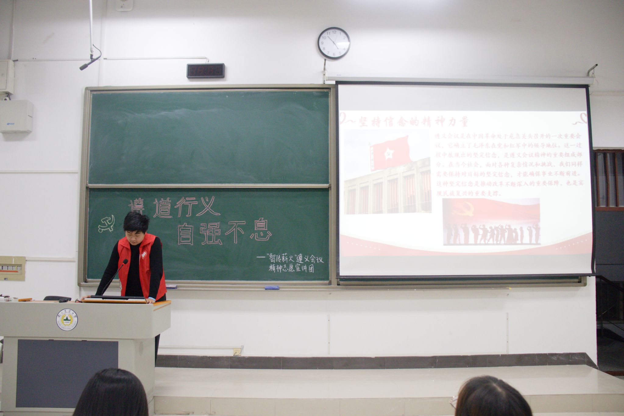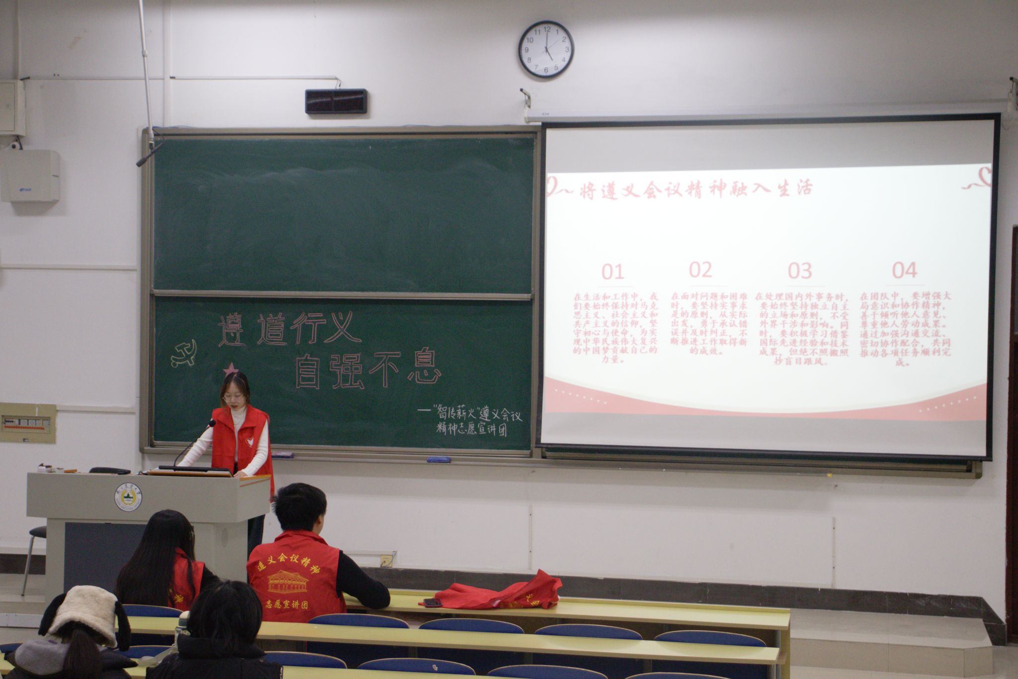 此次宣讲内容分为遵义会议的概述、遵义会议精神内涵、时代价值以及传承和发扬四个部分,宣讲团成员们通过丰富的历史案例、史料视频和生动的讲解,带领同学们全面回顾了遵义会议的历史背景、基本过程及其在中国革命史上的重要地位。