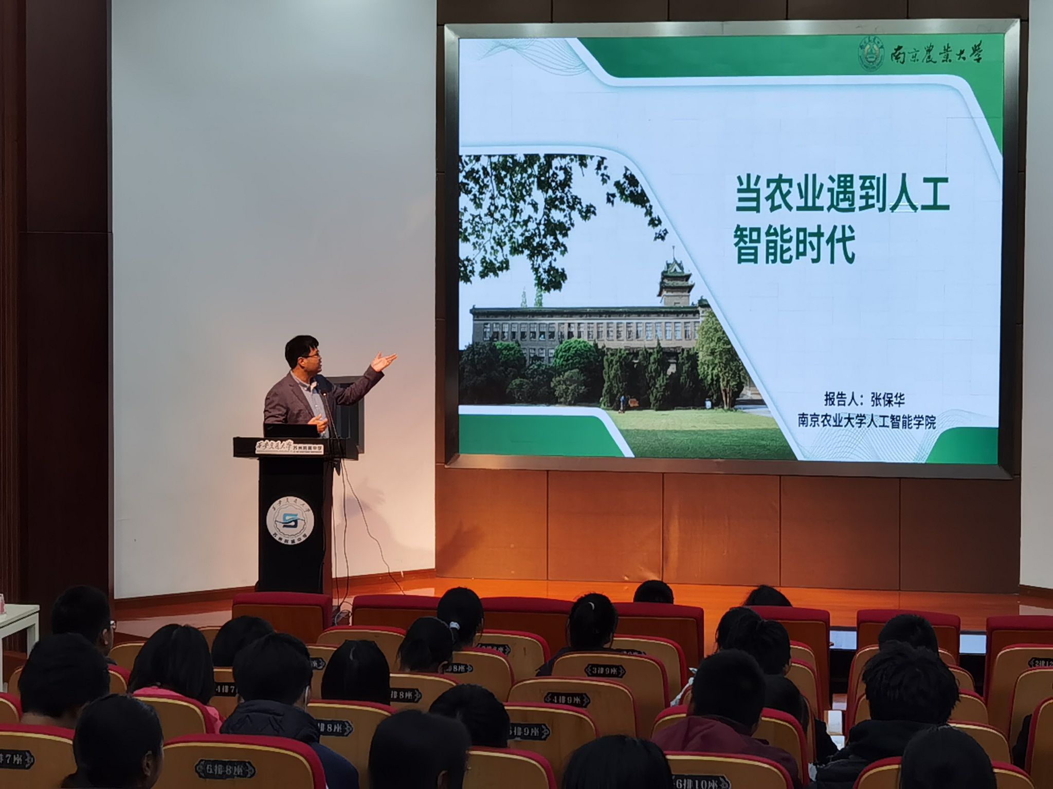 随后,张保华为西交大苏州附中的师生带来主题为《当农业遇到人工智能时代》的专题讲座。他介绍了人工智能、机器学习等前沿科技在农业机器人、智能农业装备等方面的交叉应用,通过智能播种、机器采摘等多个案例生动阐述了农业与人工智能的融合发展。此外,他着重向同学们展示了南京农业大学在相关领域的研究成果,让学生对农业与人工智能的融合有了全新的认识与深刻的理解。并引领同学们预见人工智能在乡村振兴战略实施推进过程中的广阔应用前景,带领学生们领略人工智能的魅力,在他们心中种下科技兴农的种子,激发学生对未来农业创新发展的无限遐想与探索热情。讲座后,张保华与同学们就“人工智能赋能农业”等方面的问题进行了互动与交流。
