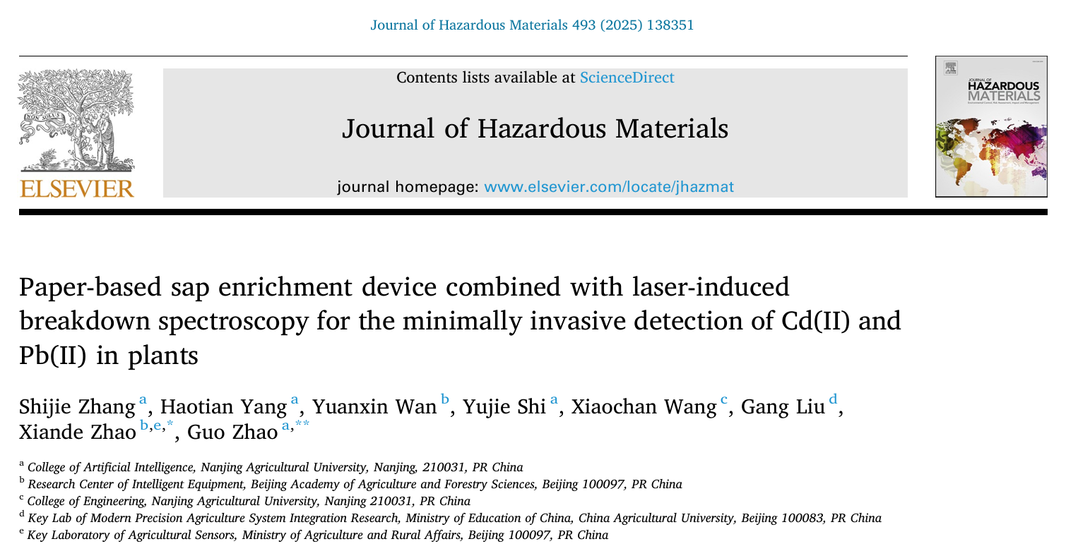 近日,我院赵国副教授团队在环境领域著名期刊《Journal of Hazardous Materials》(IF=12.2,中科院1区Top)上发表了题为“Paper-based sap enrichment device combined with laser-induced breakdown spectroscopy for the minimally invasive detection of Cd(Ⅱ) and Pb(Ⅱ) in plants”的研究论文,报道了基于可穿戴纸基微流控和激光诱导击穿光谱(LIBS)的植物体内重金属微损检测技术的研究成果。