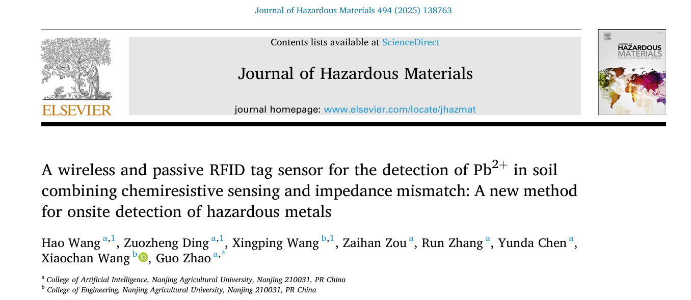 近日,我院赵国副教授团队在国际知名期刊《Journal of Hazardous Materials》(IF=12.2,中科院1区Top)上发表了题为“A wireless and passive RFID tag sensor for the detection of Pb2+ in soil combining chemiresistive sensing and impedance mismatch: A new method for onsite detection of hazardous metals”的研究论文,报道了结合化敏电阻传感和射频阻抗匹配的土壤重金属无线无源检测技术的研究成果。