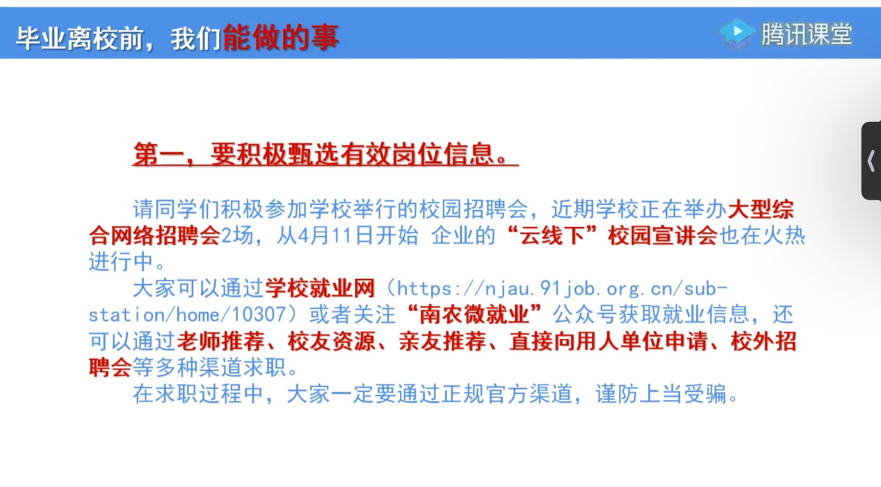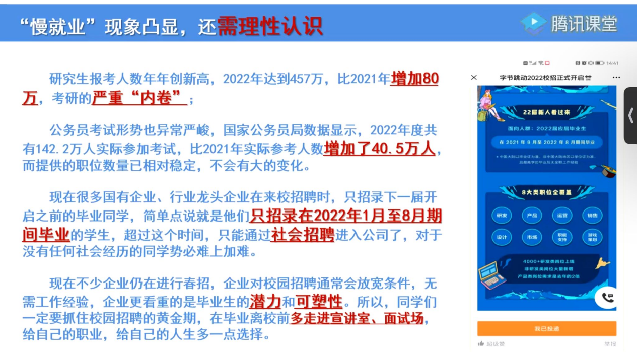 会议主要包括以下内容:一、分析严峻就业形势,鼓励应届毕业生增强信心;二、引导应届毕业生理性认知“慢就业”现象;三、着重强调应届毕业生离校前所能努力的方向;四、关于近期应届毕业生高频疑问的解答;五、指导应届毕业生及时填报去向落实系统。