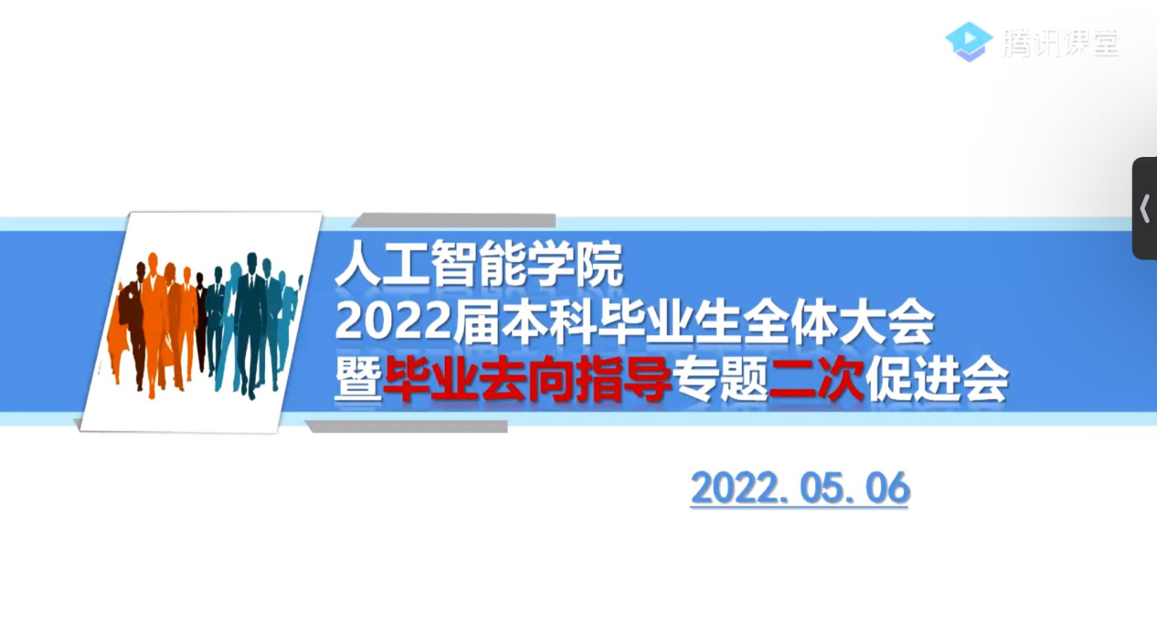 5月6日下午,在疫情形势趋好、“春季校园招聘”过半的关键时间节点,人工智能学院于线上召开2022届本科毕业生全体大会暨毕业去向指导专题二次促进会。我院计算机科学与技术、网络工程、电子信息科学与技术、自动化专业2022届近400名本科毕业生参加会议,会议由学院2018级辅导员湛斌主持。