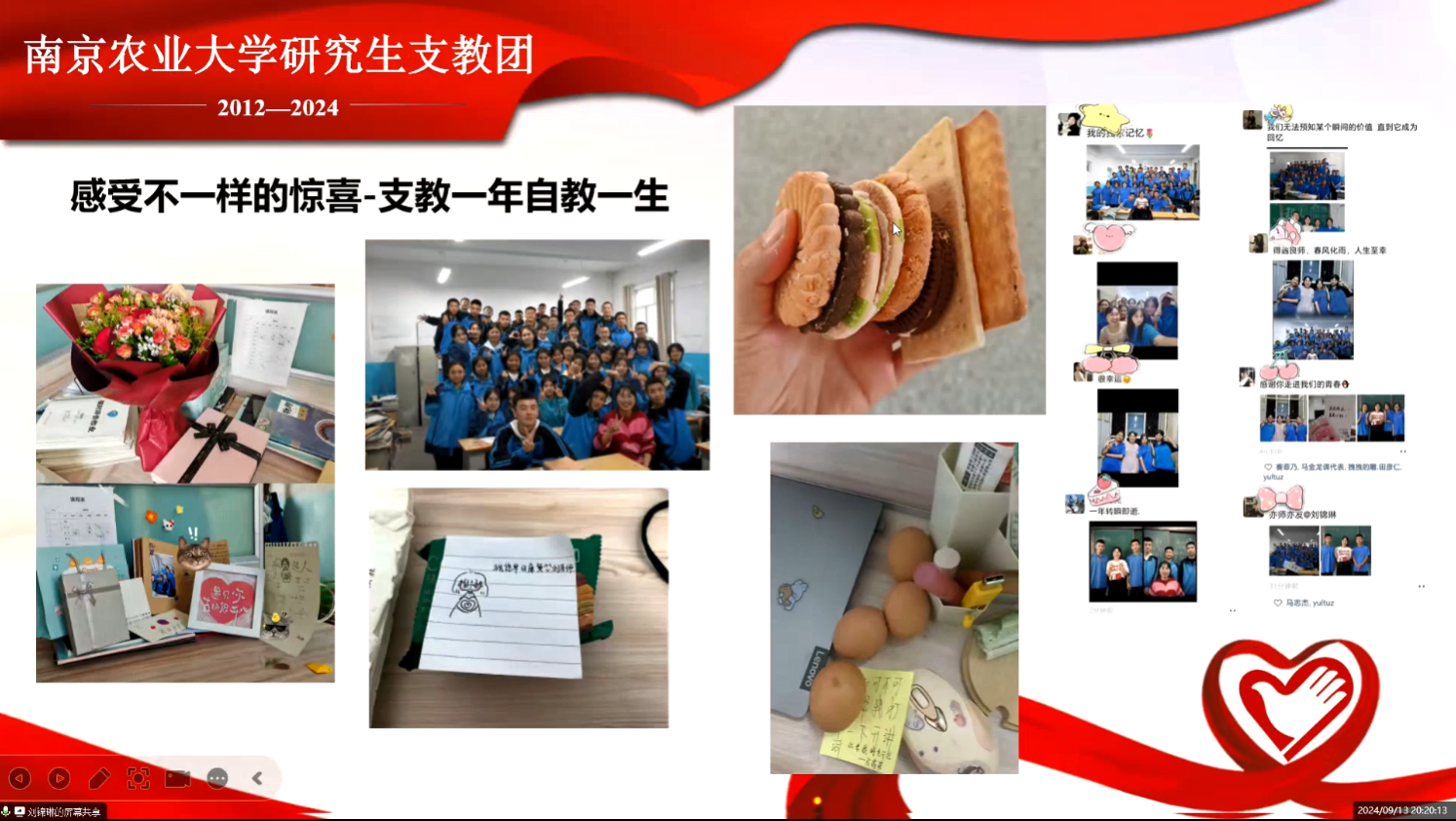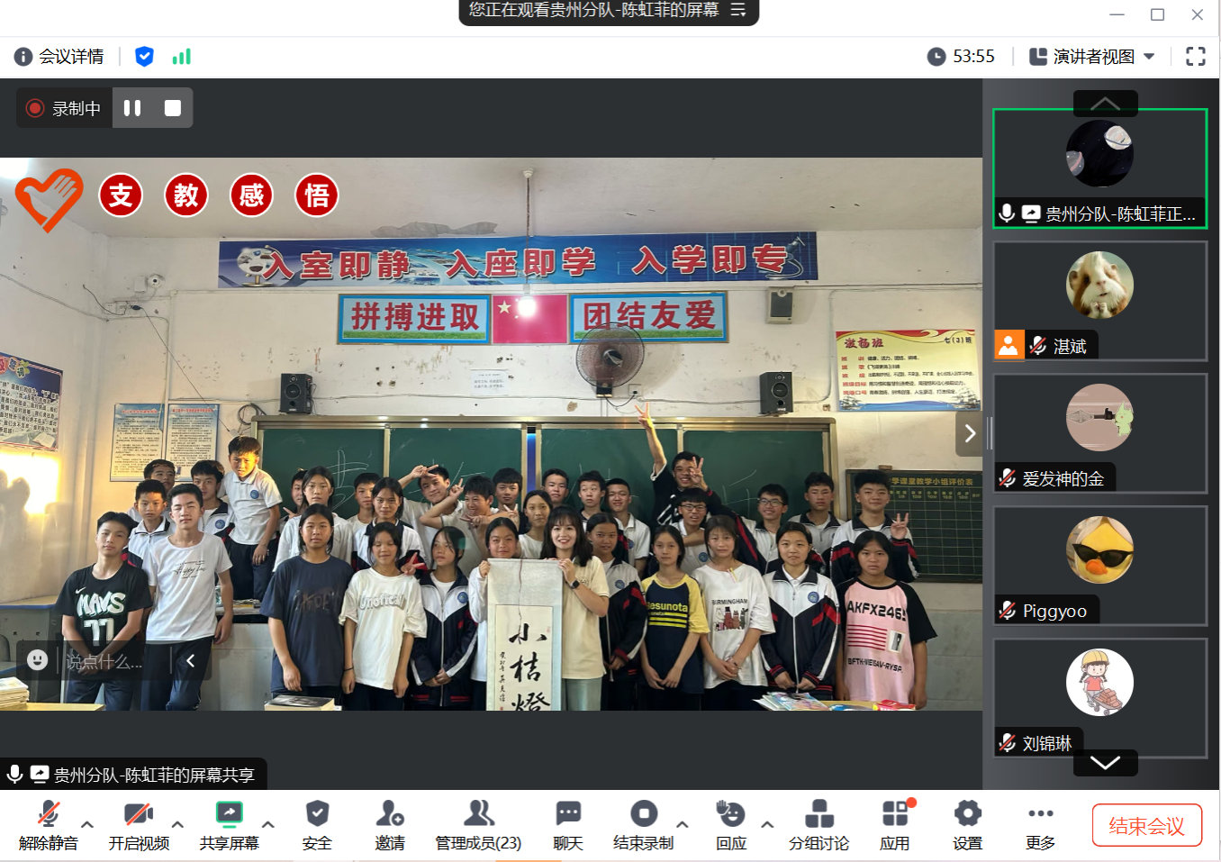随后,陈虹菲对南京农业大学“研支团”的政策进行了全面剖析,并从校园简介、工作内容、衣食住行等多方面切入,详细介绍了她在贵州地区支教工作中的点点滴滴。她表示,每当在课堂上看到学生们求知若渴的双眼和沉浸学习的身影,自己也收获了满满的自豪与感动。教育不仅仅是单方面的教授给别人知识,更是对自己成长的见证和考验。最后,她呼吁同学们都能积极加入研究生支教团,让青春力量建功立业,让志愿精神薪火相传。
