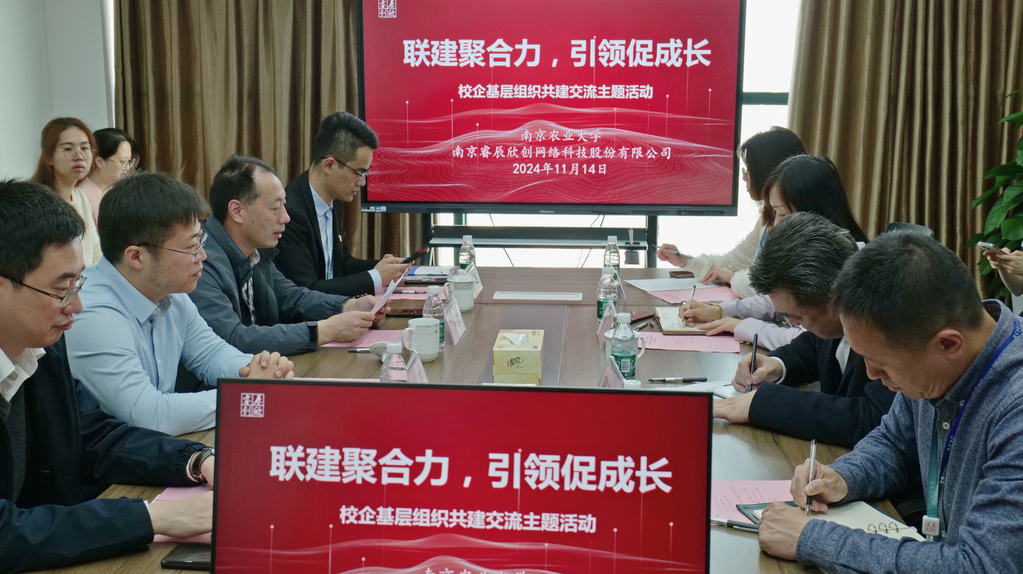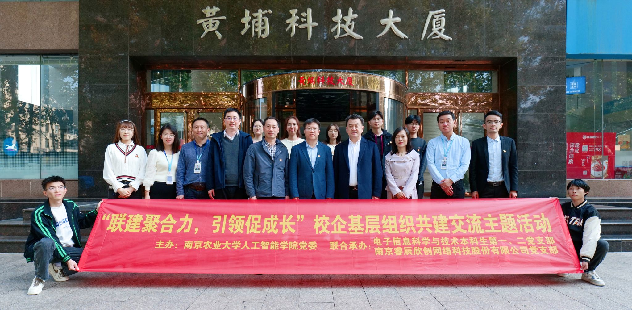 南京农业大学党委组织部部长刘亮,人工智能学院党委书记田永超、副书记吕一雷,电子信息本科第一党支部书记湛斌、第二党支部教师代表于佳琪,以及支部各年级学生党员代表共同参与此次活动。南京睿辰欣创网络科技股份有限公司董事长兼党支部书记隋文涛、副总经理范士海、总经理助理梁娜、人力资源总监黄金芳、市场发展部经理王意热情接待了我校一行。