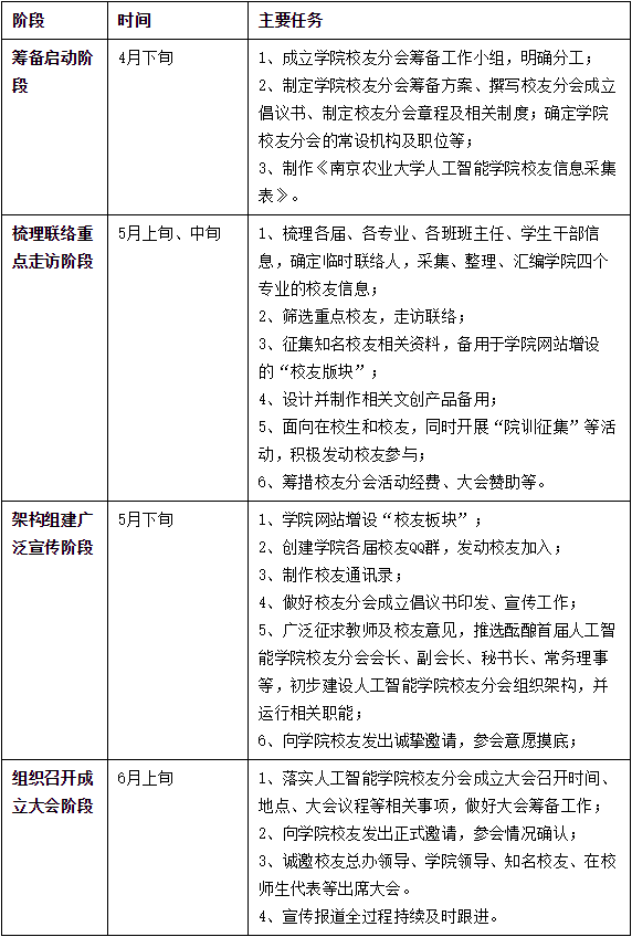 人工智能学院校友分会筹备工作主要分为四个阶段,即筹备启动阶段、梳理联络重点走访阶段、架构组建广泛宣传阶段、组织召开成立大会阶段。各阶段进度安排及主要工作任务详见下表: