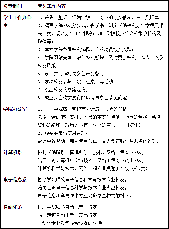 为明确前期筹备工作职责及分工,保障各项工作落实,特成立“人工智能学院校友分会筹备工作小组”。